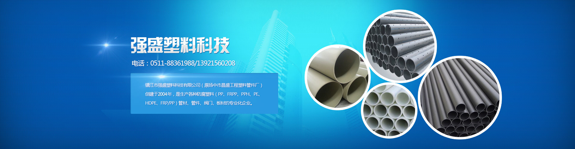 鎮(zhèn)江市強盛塑料科技有限公司(原揚中市昌盛工程塑料管件廠)創(chuàng)建于2004年,是生產(chǎn)各種防腐塑料(PP、FRPP、PPH、PE、HDPE、FRP/PP)管材、管件、閥門、板材的專業(yè)化企業(yè)。公司擁有各類先進生產(chǎn)設(shè)備,固定資產(chǎn)約3800萬元,可生產(chǎn)管材、管件口徑為Φ15-Φ1200mm,產(chǎn)品規(guī)格齊全。目前產(chǎn)品廣泛適用于醫(yī)藥、食品、冶金、造紙、電力、礦山、城市污水處理、垃圾填埋、輕工紡織等領(lǐng)域,暢銷全國各省市自治區(qū),遠(yuǎn)銷二十多個國家及地區(qū)。